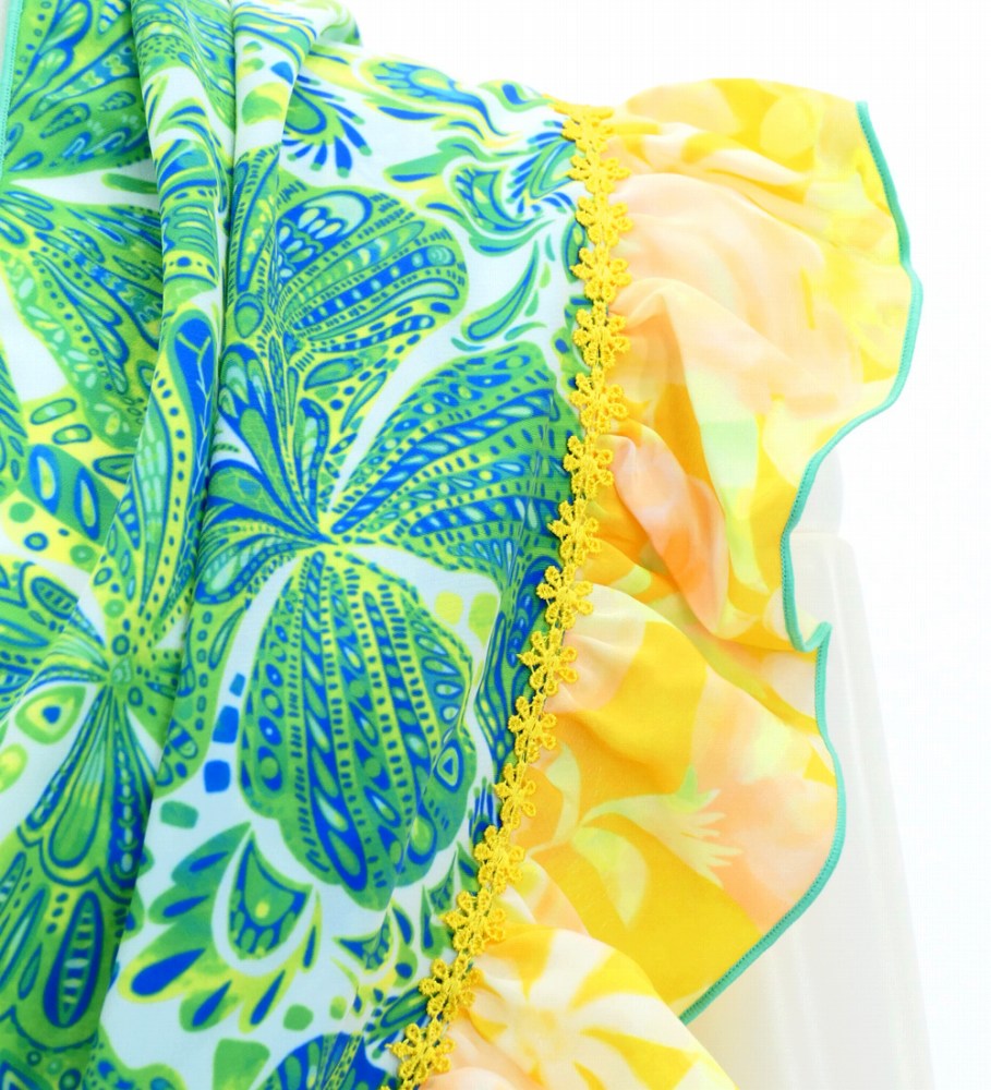 - Luxury Collection, green with butterfly paisley , turquoise blue stitching, yellow flower trim.