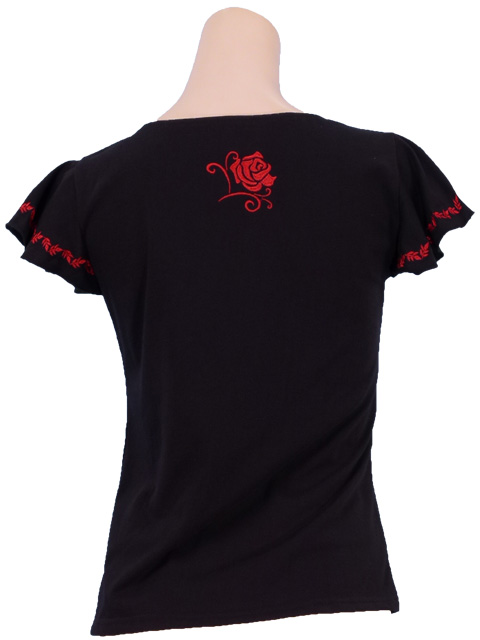 OVERVIEW: - Frilled sleeve with rose embroidery - Red embroidery on black T-shirt - Weight: 150g *The average weight of this product may vary in each size.
